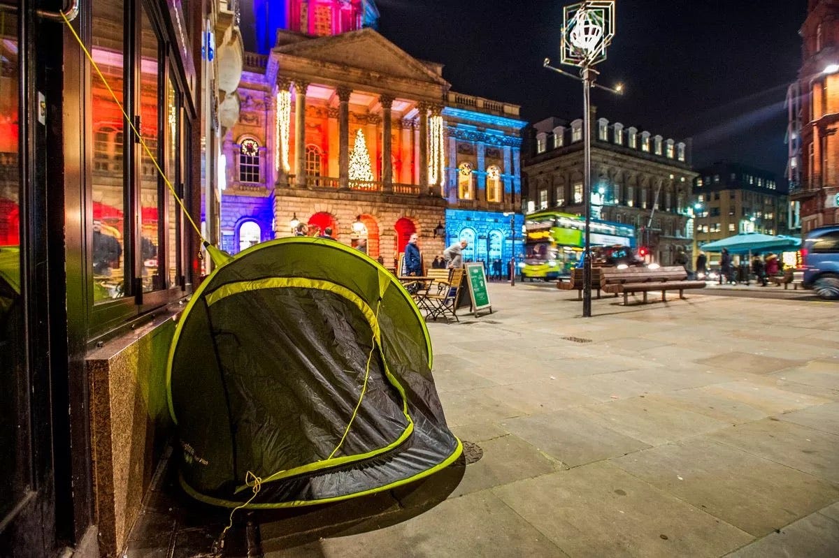 I saw something that I have never witnessed before: tents, like literal tents, lining the main shopping streets of the city. When I say lining the streets, these weren’t even pitched up in the doorways of closed retail units—these were literally on the pavements of the main shopping arteries, and there were plenty of them… My guilt kicked in, and I started to think about how the cost of the tree could have fed a whole heap of the homeless men and women of my own town. I then started thinking about the cost of my 36 hours in the city and thought how that would have helped even more.